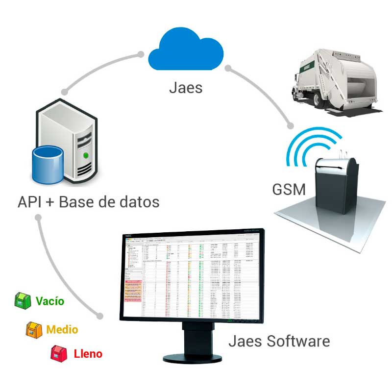 JAES Sistema de control de nivel de llenado de RSU y gestión de rutas de recogida de los contenedores. Permiten gestionar la recogida desde un puesto de control remoto.