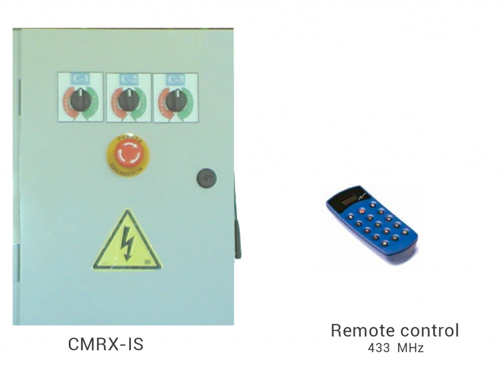 La función principal de los CMRx-IS es actuar sobre los motores y electroválvulas de las bombas hidráulicas, gobernando así las plataformas de los contenedores soterrados de carga lateral y trasera CMRX-IS comandados manualmente, vía Radio 433MHz o mediante Smartphone APP